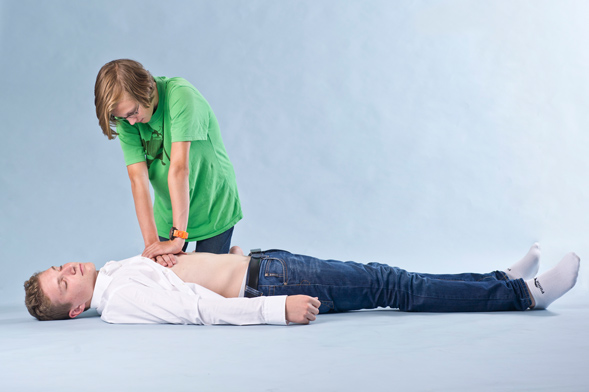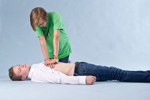 Nun drückst du wieder 30 Mal auf das Brustbein. Diese Kombination aus 30 Mal drücken und 2 Mal beatmen führst du solange durch, bis dich jemand ablöst oder du einfach nicht mehr kannst.