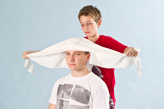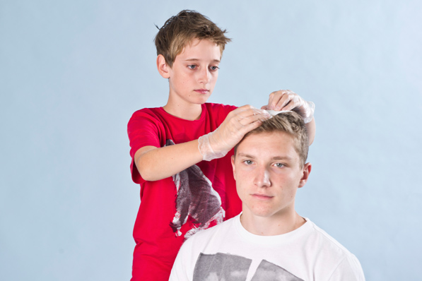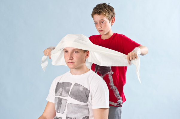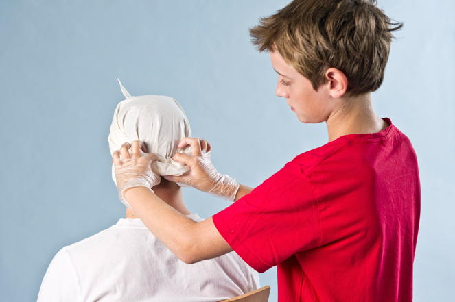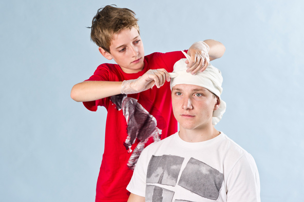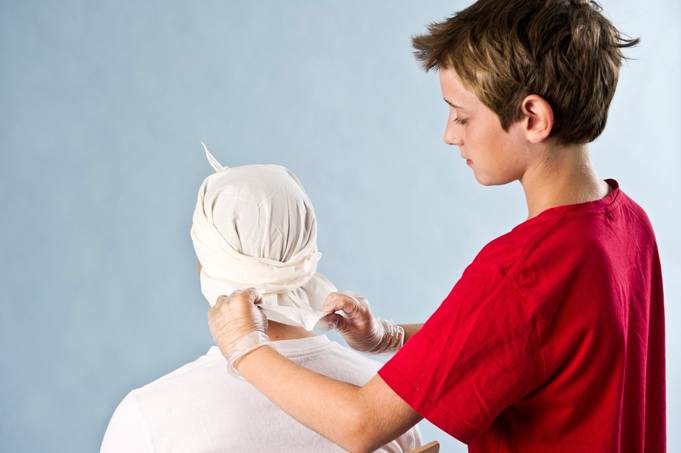 Bei Verletzungen am Kopf kannst du einen Verband anlegen.
